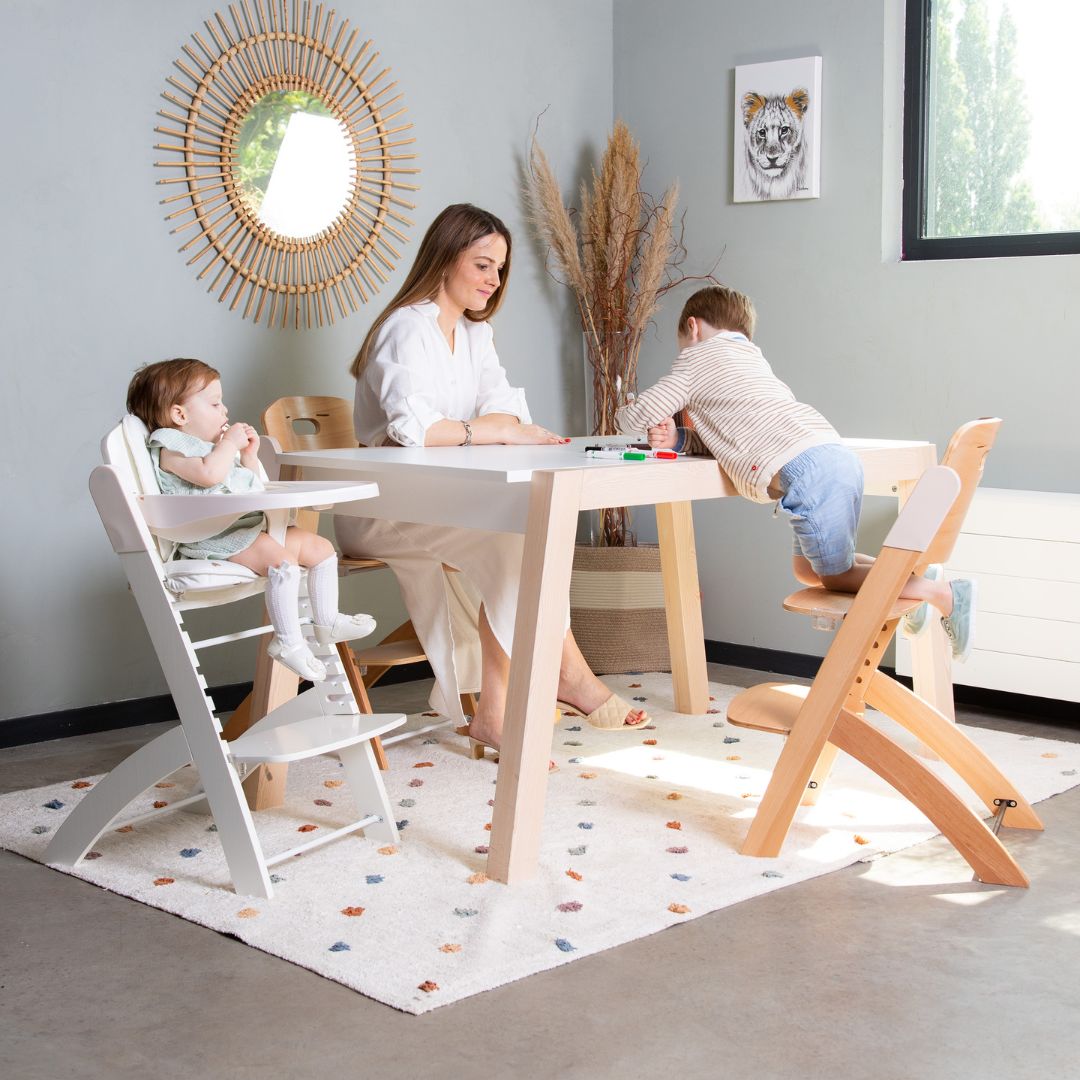 The ultra-designed Evosit high chair can be used from birth through to adulthood (85 kg maximum). Evosit is standard equipped with bumper, tray and harness. It can be adjusted in just one click! No need for a screwdriver and no visible screws! So families can enjoy it for generations!